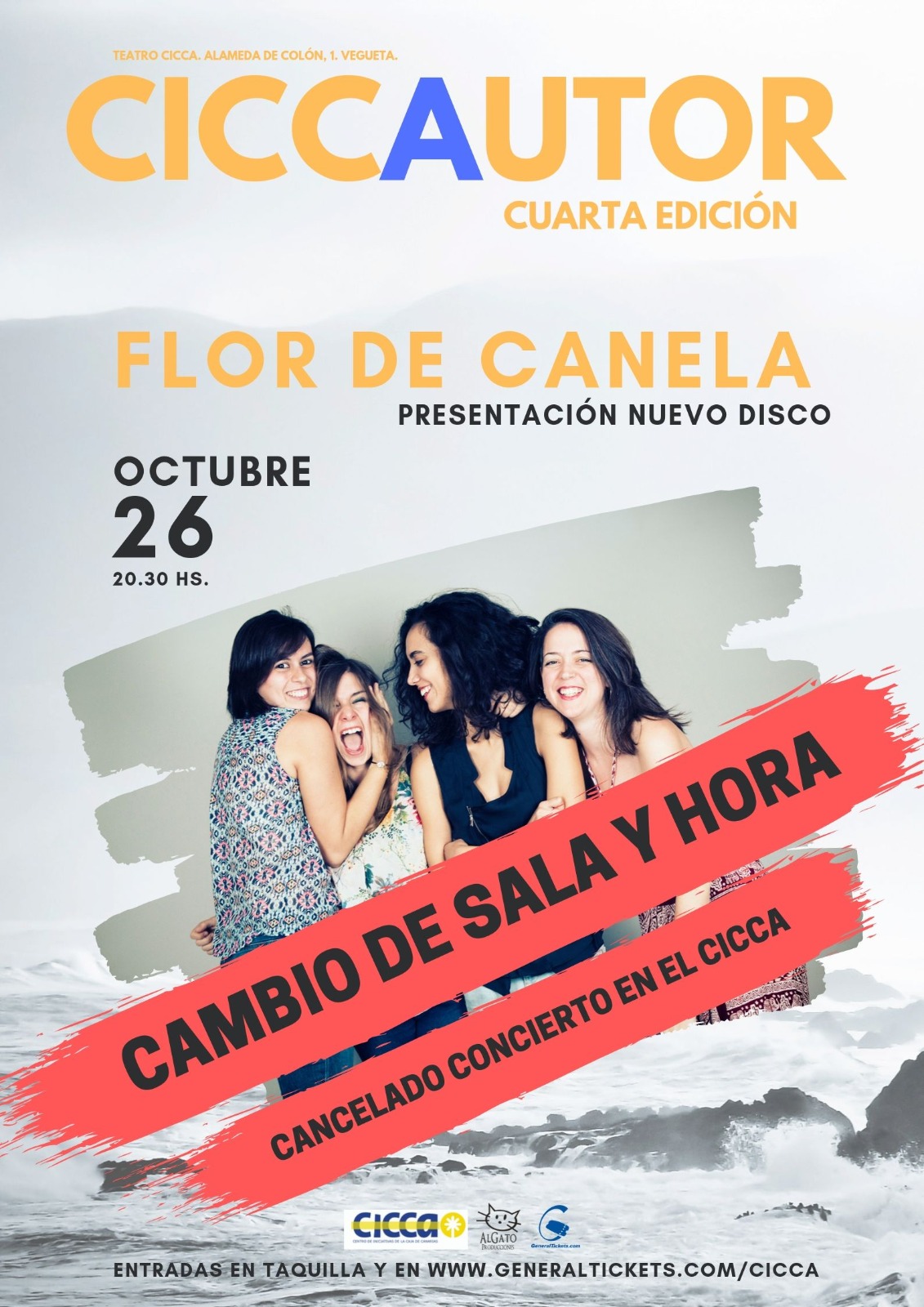 Por motivos técnicos relativos al sonido del Teatro/Auditorio, les comunicamos que nos vemos obligados a cancelar el concierto que “FLOR DE CANELA” tenía previsto celebrar en el CICCA el próximo día 26 de Octubre de 2019 en nuestro teatro. No obstante, nos complace informarles que ya está programado un concierto de “FLOR DE CANELA” en el AUDITORIO el SÁBADO 26 de Octubre a las 21:00 horas. Las entradas pueden adquirirse en las taquillas del Auditorio Alfredo Kraus y Teatro Pérez Galdós, www.auditorio-alfredokraus.com y www.mgticket.com.